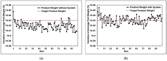 With this system, the product weight was more stable than for the process without such a system, with the variation of the product weight and the coefficient of variation of the product weight decreasing to 0.21% and 0.05%, respectively. Based on the comparative results, the validity of the proposed system was successfully verified.