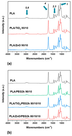 FTIR spectra of PLA (a) with 10 wt% ceramic fillers and (b) with 10 wt% PEG. The arrows correspond to peaks that are detailed in Table 2 below.
