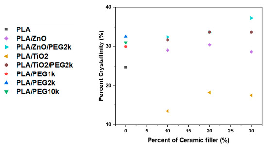 Although our results revealed little difference between the Tm of the composites and pure PLA filaments, integration of the DSC thermograms revealed that significant changes in PLA crystallinity had occurred (Figure 6; Table SI3). Compared to the PLA filament, which was 25% crystalline, incorporating the polymer plasticizer PEG into PLA led to an increase in crystallinity. Inclusion of 10 wt% PEG1k, PEG2k, or PEG10k yielded filaments with 30%, 32%, and 31% crystalline PLA, respectively. Additionally, the ternary composite filaments comprising PLA, ceramics, and PEG exhibited double melting peaks (see Figure 5c). This behavior was observed for all the ZnO ternary composite filaments and only at higher TiO2 concentrations (20 wt% and 30wt%), where the two peaks were at most 10 °C apart.