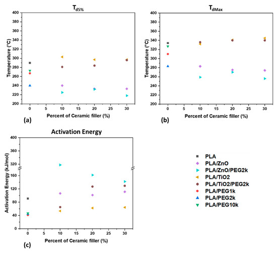 The thermal properties of the composite filaments: (a) the onset of thermal degradation (Td5%); (b) the decomposition temperature (TdMax); and (c) the activation energy.