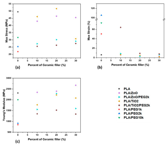 The mechanical properties of the composites with ceramic fillers and PEG are shown in Figure 8. It was observed that 10 wt% PEG2k reduced the maximum stress of all samples with ZnO and TiO2. Additionally, while altering the amount of ceramic filler altered the maximum stress, inclusion of 10 wt% PEG2k exhibited similar values for each sample tested, regardless of filler content. The reverse was observed with regards to maximum strain; adding PEG2k increased the elongation of the samples, with the sole exception of PLA/ZnO/PEG2k 70/20/10, which was lower than PLA/ZnO 80/20. The largest change was observed in PLA/TiO2/PEG2k 80/10/10, which demonstrated a 938% increase compared to PLA/TiO2 90/10. Similar to maximum stress, adding PEG2k to the composite resulted in a reduction in the Young’s modulus for all the samples and like the maximum stress of the samples, altering the amount of ceramic filler does not significantly change the Young’s modulus in the filaments with PEG2k incorporated, with the only exception being PLA/ZnO/PEG2k 70/20/10. This sample showed minor differences compared to PLA/ZnO 80/20, suggesting that the stiffness does not change drastically.