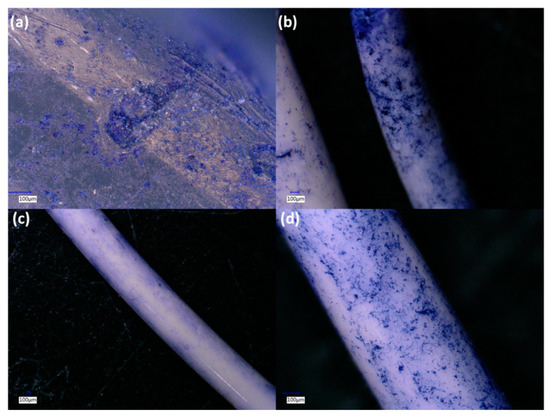 Microscopy images of stained composite filaments that were incubated in soil for a month: (a) PLA; (b) PLA/TiO2 90/10 with gelatin; (c) PLA/ZnO 90/10; and (d) PLA/ZnO 90/10 with gelatin.