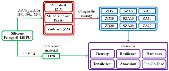 The obtained samples were subjected to mechanical and physicochemical tests. Densities were measured using hydrostatic weighing tests. Additional characterizations included radiation resistance tests, Schopper–Schlobach abrasion resistance tests, pin-on-disc test, Shore type A hardness tests, and tensile tests. A scheme of the research methodology is shown in Figure 1. All tests were carried out at room temperature (22 °C, humidity: 50%).