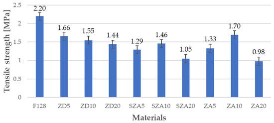 The tensile strength of the composite materials was characterized by lower values than the tensile strength of the silicone used as the F128 matrix (2.2 MPa). For composites with zinc dust filler, the tensile strength decreased upon increasing the amount of filler (ZD5—1.66 MPa, ZD10—1.55 MPa, and ZD—1.44 MPa). Similar trends were also observed for materials with hay and spread zinc ash. The samples with 5% filler had a lower tensile strength than the samples with 10% filler. For samples with 20% filler, a decrease in the tensile strength was observed. The SZA20 and ZA20 samples had the lowest tensile strength values of 1.05 and 0.98 MPa, respectively. For both groups, this is a decrease by more than half of the tensile strength.