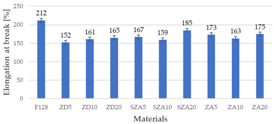 The mechanical properties of all tested materials are shown in Table 5, and the same properties are shown graphically in Figure 5, Figure 6 and Figure 7. Figure 5 shows the Young’s moduli, Figure 6 shows the tensile strength, and Figure 7 shows the elongation at break.