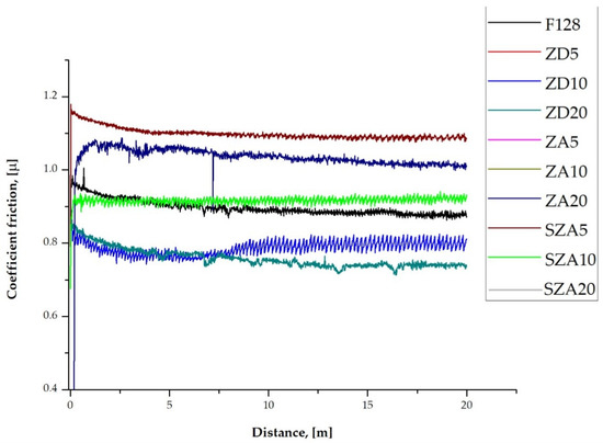 Figure 9 and Table 7 show changes in the friction coefficient as a function of distance for the tested samples. The graphs recorded for some samples are not visible because they overlap with others. This results from the same coefficients of friction. The graphs also do not show significant oscillations between themselves. Similar graphs of the coefficients of friction were recorded for the ZD5–ZD20 and SZA10–SZA20 samples. The graphs recorded for the ZA samples were similar in all cases.