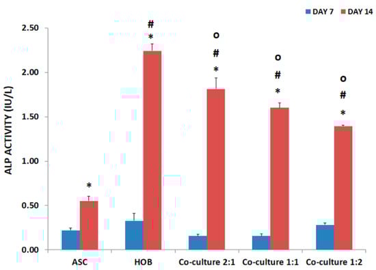 ALP activity in PCL-HA at days 7 and 14. ALP activity is the highest in HOB compared to other groups. ALP activity increased significantly in all co-cultured groups as compared to ASC at day 14. * Indicates significant difference where p < 0.05, relative to day 7, # indicates significant difference where p < 0.05, relative to ASC (control group), O indicates significant difference where p < 0.05, relative to HOB (control group).