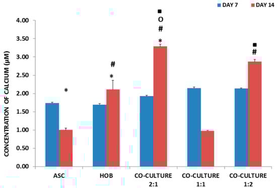Calcium deposition in PCL-HA at days 7 and 14. Among the co-cultured groups, ASC/HOB at 2:1 has the highest calcium deposition (p < 0.05) and it is also significantly (p < 0.05) increased when compared to the control groups. * Indicates significant difference of p < 0.05, relative to day 7, # indicates significant difference of p < 0.05, relative to ASC, O indicates significant difference of p < 0.05, relative to HOB, ▪ indicates significant difference of p < 0.05, relative to ASC/HOB co-cultured at 1:1.
