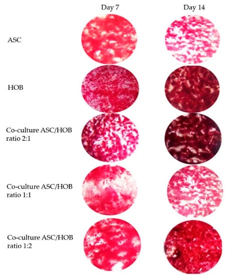 All groups were subjected to calcium deposition evaluation (Figure 4) at days 7 and 14. Calcium deposition was found to be significantly increased (p < 0.05) at day 14 as compared to day 7 in HOB and in ASC/HOB co-cultured at 2:1, but it was significantly decreased (p < 0.05) in ASC. All groups except for ASC/HOB co-cultured at 1:1 was significantly increased (p < 0.05) when compared to ASC by approximately 3-fold in ASC/HOB co-cultured at 2:1 and 1:2 and by 2-fold in HOB. Among the co-cultured groups, we found that calcium deposition was significantly increased (p < 0.05) by approximately 3-fold in ASC/HOB co-cultured at 2:1 and 1:2 as compared those co-cultured at 1:1. Cell samples stained with Alizarin Red S was also observed microscopically (Figure 5) and results obtained reflects the data in Figure 4, where significant difference can be observed at day 14, particularly in ASC/HOB co-cultured at 2:1.
