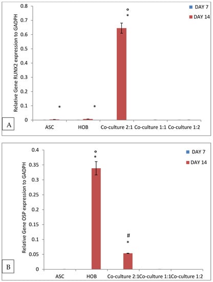 All groups were subjected to ALP activity evaluation at days 7 and 14 (Figure 3). ALP activity at day 14 was significantly higher (p < 0.05) as compared to day 7. Being a mature osteoblast, HOB (2.24 ± 0.08) has the highest ALP activity compared to other groups at day 14. Although there was an increase in ALP activity among the co-cultured groups at day 14, they were significantly lower (p < 0.05) as compared to HOB by approximately 1-fold. However, the co-cultured groups were significantly increased (p < 0.05) as compared to ASC by 3-fold in both ASC/HOB at 2:1 and 1:1 and by 2.5-fold in ASC/HOB at 1:2. On the other hand, there were no significant differences in the ALP activity among the co-cultured groups.