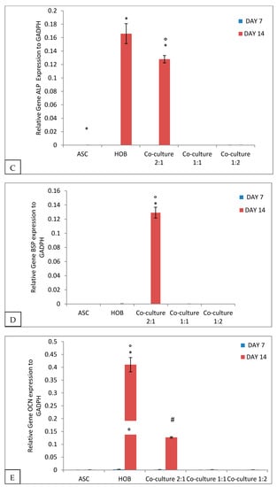 All groups were evaluated for osteogenic gene expression analysis when seeded in PCL-HA scaffold using quantitative RT-PCR (Figure 6). The analysis showed that co-cultured ASC/HOB at 2:1 showed the highest expression (p < 0.05) of Runx (6.45 × 10−1 ± 3.56 × 10−2) with more than 100 folds increase as compared to other groups at day 14 (Figure 6A). OSP showed a significant increase (p < 0.05) in expression in ASC/HOB co-cultured at 2:1 (5.35 × 10−2 ± 6.57 × 10−4) with more than 100 folds increase when compared to those co-cultured at 1:1 and 1:2 at day 14 (Figure 6B). However, OSP expression in ASC/HOB co-cultured at 2:1 was significantly lower (p < 0.05) when compared to HOB (3.39 × 10−1 ± 2.23 × 10−2). ALP expression (Figure 6C) was also significantly increased in ASC/HOB co-cultured at 2:1 (7.15 × 10−2 × 5.44 × 10−3) with more than 100 folds increase as compared to other groups but was significantly lower as compared to HOB (8.46 × 10−2 ± 1.48 × 10−2). Similarly, BSP expression was significantly (p < 0.05) increased in ASC/HOB co-cultured at 2:1 (1.29 × 10−1 ± 7.6 × 10−3) with more than 100 fold as compared to ASC, co-cultured groups at ratio of 1:1 and 1:2 (Figure 6D). OCN expression (Figure 6E) was significantly increased in ASC/HOB co-cultured at 2:1 (1.27 × 10−1 ± 2.52 × 10−3) when compared to those co-cultured at 1:1 and 1:2 with more than 50 folds and more than 100 folds increase, respectively but was significantly lower when compared to HOB (4.1 × 10−1 ± 2.78 × 10−2).