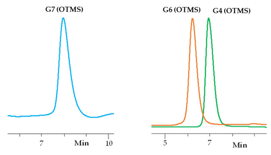 Gel Permeation Chromatography (GPC) curves of the obtained carbosilane-siloxane dendrimers (MSOCSD G4 (OTMS), and G6 (OTMS), G7 (OTMS)) after chromatographic purification.