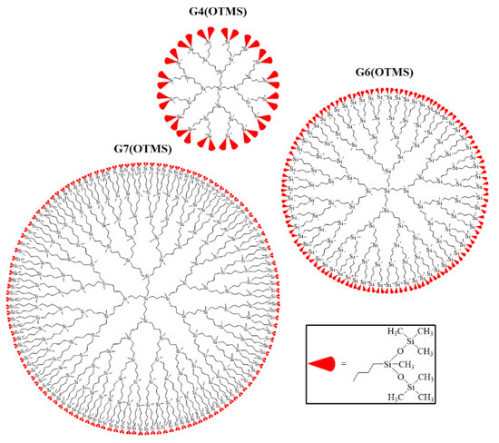Homologous series of the obtained carbosilane dendrimers G4 (OTMS), G6 (OTMS), and G7 (OTMS) with a non-functional siloxane shell schematically shown by red.