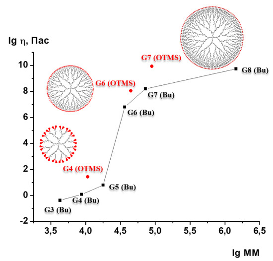 Viscosity of the hybrid polycarbosilane-siloxane dendrimers versus their molecular mass (red circles) compared to the MM dependence of the viscosity of the homologous series of poly(bytil)carbosilane dendrimers (black squares) studied earlier [34].