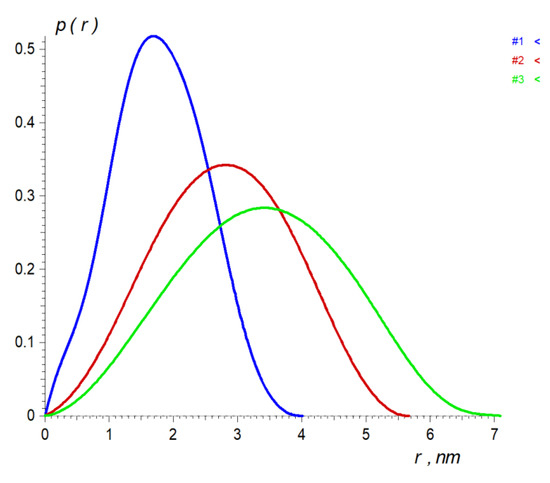 Distance distribution p(r) functions computed from the experimental SAXS data from the 4th (blue), 6th (red) and 7th (green) generations of carbosilane-siloxane dendrimers.