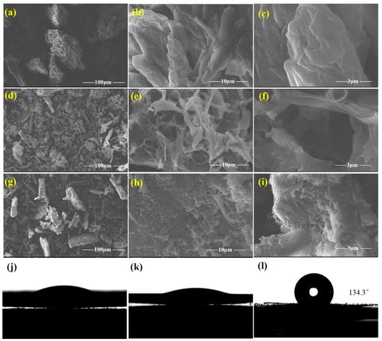 SEM micrographs of cellulose (a–c), cellulose-OH (d–f), cellulose-St (g–i), and the static sessile drop water contact angles of cellulose (j), cellulose-OH (k), cellulose-St (l).