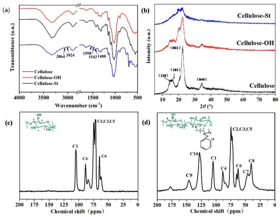 The FTIR spectra (a) and XRD spectra (b) of cellulose, cellulose-OH, and cellulose-St, and 13C NMR spectra of cellulose (c) and cellulose-St (d).