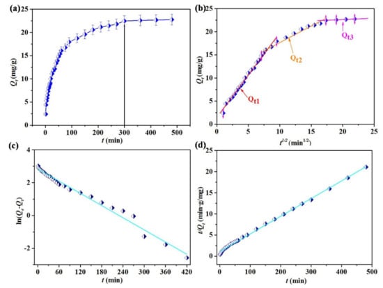 Adsorption kinetic (a), intraparticle diffusion model (b), pseudo-first-order kinetic (c) and pseudo-second-order kinetic (d) of nitrobenzene (NB) on cellulose-St (temperature: 298 K; reuse studies of cellulose-St; initial NB concentration: 10 mg L−1; amount of cellulose-St: 10 mg; volume of NB solution: 50 mL).