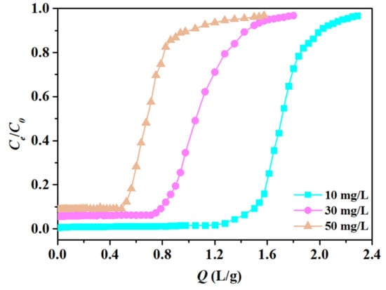 Dynamic adsorption was more capable of reflecting the potential of engineering applications of material than static adsorption. Hence, the practical availability of cellulose-St on the adsorption of NB was not only studied with static experiments but also dynamic adsorption, and the results were shown in Figure 4. Dynamic adsorption tests were performed with three different initial concentrations (10 mg/L, 30 mg/L, and 50 mg/L) at atmosphere, and filler had an aspect ratio of 1:8. The treatment amount of NB with a feed concentration of 10 mg/L was 1.275 L/g. When the feed concentration was increased to 30 mg/L and 50 mg/L, the treatment amount decreased to 0.75 L/g and 0.5 L/g. Before reached the breakthrough point, no NB was detected in the effluent at the initial concentration of 10 mg/L, while it was not when the initial concentration increased to 30 mg/L and 50 mg/L. Furthermore, the higher the initial concentration of NB, the shorter time to reach penetration point and final balance. Apparently, a high inlet velocity of wastewater resulted in shorter contact time for NB and cellulose-St and small average adsorption sites, which may be reflected by the increased export concentration with the increased input initial concentration before reaching individual throughput. The lower the initial concentration of the feed liquid in a certain range, the larger the treatment amount, but the initial concentration of the feed liquid was not unlimited. The mass transfer driving force will be too small when the initial concentration of the feed liquid was too low, resulting in a decrease in adsorption capacity and effective utilization rate. All in all, cellulose-St can be applied to the wastewaters with a low content of NB.