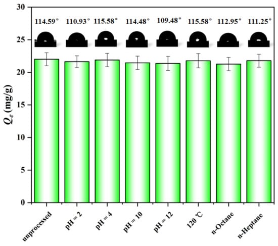 In practical applications, it was often not a simple aqueous solution, but also various harsh conditions, so the environmental adaptability of adsorbent was essential. To examine its environmental adaptability, cellulose-St was placed in a variety of harsh environments. Cellulose-St was immersed in strong acid (pH = 2, pH = 4), strong alkali (pH = 10, pH = 12), and organic solvent (n-octane, n-heptane) environment for 24 h, respectively. Then, the water contact angles and adsorption amount for NB of processed cellulose-St were measured. From Figure 5, we can see that the samples after the above several treatments still exhibited excellent hydrophobic properties. The treated sample was applied to the adsorption of NB, and the change in the adsorption value was within 1 mg/g. Therefore, cellulose has excellent environmental adaptability and can be applied to adsorb NB in various harsh water environments.
