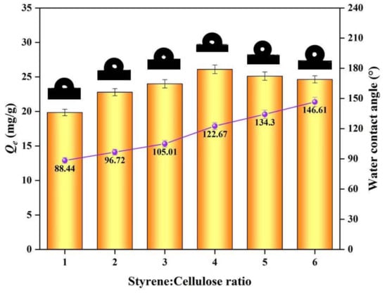 Through the above experiments, we found that cellulose-St showed an ability for adsorbing NB. However, a blank control experiment showed that cellulose and cellulose-OH had no adsorption effect on NB (Figure S6 from Supplementary Materials). Therefore, it can be concluded that the introduction of styrene was the key to the occurrence of adsorption. In order to explain the specific effect of styrene on adsorption and reveal the adsorption mechanism, several samples with different water contact angles were successfully prepared by adjusting the amount of styrene added during the preparation process, and the adsorption was studied under the same conditions. The water contact angles of the samples and the corresponding adsorption amount were shown in Figure 6. The water contact angles ranged from 88.44° to 146.61° with the different grafting rates. Within a predetermined range, the higher the hydrophobicity, the larger the corresponding adsorption amount, but when the water contact angle reached the threshold, the adsorption amount will decrease. In a suitable range of hydrophobicity, nitrobenzene exhibits repulsion due to its opposite polarity to water, forcing nitrobenzene to move closer to the adsorbent and undergo physical and chemical adsorption. While after the hydrophobicity reached a certain level, the contact area between the aqueous solution and the adsorbent was reduced, which affected the contact of the nitrobenzene in the aqueous solution with the adsorbent, thereby a decline of the adsorption amount was observed.
