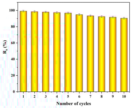 The reusability of the adsorbent was very essential to employ in the environmental region. The used cellulose-St was separated from the aqueous solution by filtration and washed with ethanol several times. After being dried, the used cellulose-St was applied for the recycle test of NB adsorption, and the results were shown in Figure 7. It could be found that cellulose-St still had an adsorption capacity of 90.1% of the original adsorption capacity even after ten cycles. The results demonstrated that cellulose-St had excellent recyclability and could be regarded as a potential adsorbent for removing NB from aqueous solutions. Furthermore, the reusability of cellulose-St was compared with other adsorbents reported previously as shown in Table 4. Due to its lower environmental impact, ethanol was an effective method for desorption of NB compared to other organic solvents such as methanol, toluene, and acetone. The recyclability rate obtained from this work were found to be much higher than that of some adsorbents in Table 4.