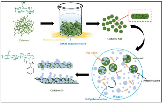 Cellulose powders as raw materials were firstly treated by NaOH solution to obtain the precursor (cellulose-OH) which possessed lower crystallinity, more pleasing specific surface area, and better reactivity than raw materials. Ultrapure water as a solvent for polymerization instead of organic solvent had the advantages of safety, wide range of sources, low cost, and environmental protection. Then, the surface interaction force was enhanced by an emulsifier, and the reaction system proceeded under the action of a radical initiator. In the process, cellulose and styrene underwent a disordered graft polymerization activity, including the self-polymerization of styrene. The free polystyrene would be removed by Soxhlet extraction of toluene in a subsequent treatment. The desired dried product was obtained by vacuum drying. Scheme 1 showed the brief proposed synthesis of the graft copolymers.