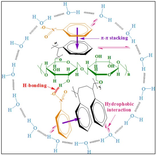 Based on the above results, we speculate that the mechanism for cellulose-St to adsorb NB is shown in Scheme 2. In the adsorption process of NB onto cellulose, the NB and cellulose-St are compelled to attach firstly by hydrophobic interaction, due to the difference in polarity between the two and water molecules. Nitrobenzene is π-electron-deficient with a strong dipole moment. Therefore, it acts as a π-acceptor with cellulose-St surface sites. Nitrobenzene oxygens are H-bond acceptors with the remained hydroxyl groups, similar to nitroaromatic adsorptions on graphene oxide [55]. The rich aromatic regions on the cellulose-St supported by styrene chain are π-electron donors for NB stacking. In summary, NB adsorption over a wide pH range by multiple mechanisms. π–π interactions may predominate because NB possesses polarized aromatic π-electron systems interactive with the extended aromatic regions of cellulose-St. H-bonding interactions between surface functional groups and –NO2 groups can contribute to it.