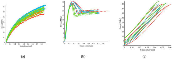 Stress-Strain curves of tested material: (a) SEBS; (b) polyolefin; (c) PLA. Not treated, green lines; Cleaned, blue lines; Cleaned and dried, red lines.