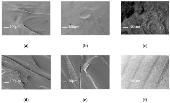 SEM analysis of 3D printed polymer surfaces: (a) Detail of just printed PLA; (b) Detail of just printed polyolefin polymers; (c) Detail of just printed medical-grade SEBS polymer; (d–f) Printed surface after cleaning/disinfection of printed polymers used for the mask realization: PLA, polyolefin and SEBS respectively.