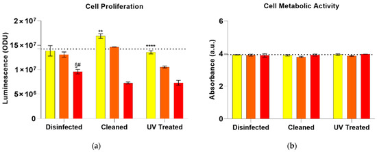 (a) Cell proliferation assay (b) and metabolic activity test on A431 epithelial cells after 24 h of culture. ** p = 0.012 PLA cleaned vs. SEBS cleaned; **** p < 0.0001 PLA UV treated vs. SEBS UV treated; § p = 0.0008 polyolefin disinfected VS. polyolefin cleaned; # p = 0.001 polyolefin disinfected VS. polyolefin UV treated. Dotted lines = TCPs control value. Yellow: PLA; Orange: SEBS; Red: polyolefin.
