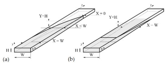 Recently, Wilczynski et al. [3] have performed extensive experimental studies on single screw extrusion of a polypropylene (PP) composite. Based on these studies, the authors developed the only available global model of extrusion of wood polymer composites [4]. According to these studies, the composite solid conveying and melting were strongly dependent on the wood filler content. The well-known classical mechanism of polymer melting developed by Tadmor et al., e.g., [22], was absent in the case of composites with high filler content (over 50%). The characteristic polymer melt “pool” was not observed at a pushing flight of the screw. However, in the case of composites with low filler content (less than 50%), this mechanism was seen. According to these observations, two models of melting have been proposed, a one-dimensional model for lower content of wood filler, and a two-dimensional model for higher content, which are schematically depicted in Figure 1 and described in [3,4]. In a classical two-dimensional model, when melting progresses, the volume of the solid material decreases by decreasing the solid width, i.e., X < W, Y = H (Figure 1a), while in one-dimensional model, the volume of the solid decreases by decreasing the solid height Y < H, X = W (Figure 1b).
