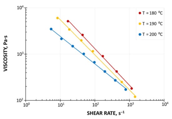 The WPC viscous properties have been measured at various temperatures with the use of a capillary rheometer (RG-25, Goettfert, Buchen, Germany). The capillaries of diameter D = 1, 2, 4 mm, and the length/diameter ratio L/D = 0/1, 0/2, 0/4, 10/1, 20/2, and 40/4 were used, and the Rabinowitsch correction, the Bagley correction, and the Mooney correction have been applied [44]. The measurements have been carried out at the temperatures T = 180 °C, 190 °C, and 200 °C, and at the shear rates from = 1 s−1 to = 1000 s−1. The examples of viscosity characteristics at the temperatures T = 180 °C, 190 °C, 200 °C are shown in Figure 2. An obvious pseudoplastic behavior is seen, which means the viscosity decreases with increasing the shear rate. The viscosity also decreases with increasing the temperature. However, the effect of temperature on the viscosity is not significant. The results of Mooney analysis are depicted in Figure 3, where the shear rate vs. 1/D (Figure 3a) and the slip velocity vs. shear stress (Figure 3b) are shown. The effects of the corrections of Rabinowitsch, Bagley, and Mooney on the viscosity curve are presented in Figure 4. Rabinowitsch correction means an increase of the shear rate at the constant shear stress (the constant capillary pressure drop), which results in shifting the viscosity curve shown in Figure 4a. Bagley correction means a decrease of the shear stress (the pressure decrease due to the pressure inlet loss) at the constant shear rate, which results in a shift in the viscosity curve depicted in Figure 4b. Mooney correction means a decrease of the shear rate at the constant shear stress (the constant capillary pressure drop), which results in shifting the viscosity curve shown in Figure 4c.