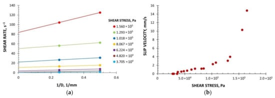 Two characteristic regions of slip behavior are seen in Figure 3. At the low shear stress, the slip can be characterized as weak, which is followed by a sharp increase in the slip velocity at the high shear stress, which was also observed, e.g., by Hristov et al. [16].