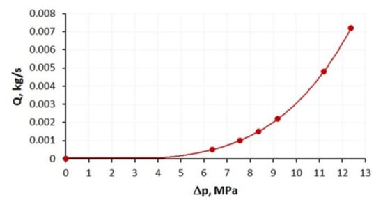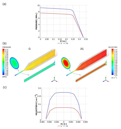 An influence of slip parameters (Fslip = 0.064, eslip = 0.43) on the polymer flow in the die is presented in Figure 6 where die characteristics are shown. The cylindrical, three-zone die of diameter D = 45 mm at the onset and diameter D = 5 at the end was used in the study. The lengths of die sections were equal to L = 180 mm. 30 mm, 60 mm (Figure 5a). Various flow rates were used for simulations: Q = 0.0005 kg/s, 0.001 kg/s, 0.0015 kg/s, 0.0021 kg/s, 0.0048 kg/s, 0.0072 kg/s. A non-linear dependence of the flow rate on the die pressure drop is clearly seen. An example of pressure and velocity distributions is shown in Figure 7. Slipping at the die surface is very low.