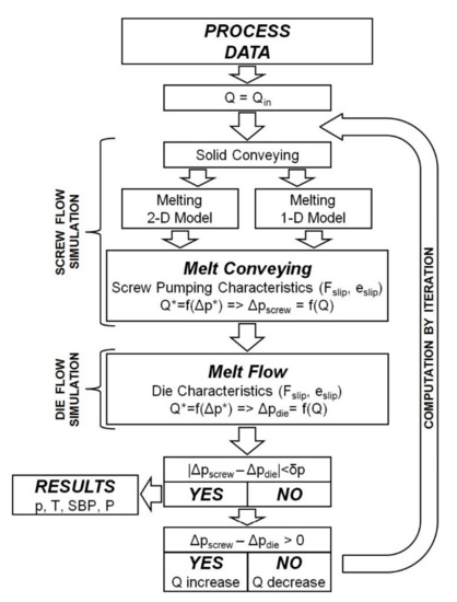 The calculation procedure is depicted in Figure 10. The conventional process with polymer flood feeding is considered here, and thus the forward scheme of calculation is applied. The computations begin with an initial mass flow rate. Then the process is modeled using different melting models (one-dimensional or two-dimensional). Afterwards, the flow characteristics with slip effects are used for flow modeling in the screw/die system. The exit screw pressure is checked for the convergence with the die pressure. Then, the polymer flow rate is changed (increased or decreased) according to the result of comparison, which can be positive or negative. The calculations are reiterated until the convergence of calculation has been reached.