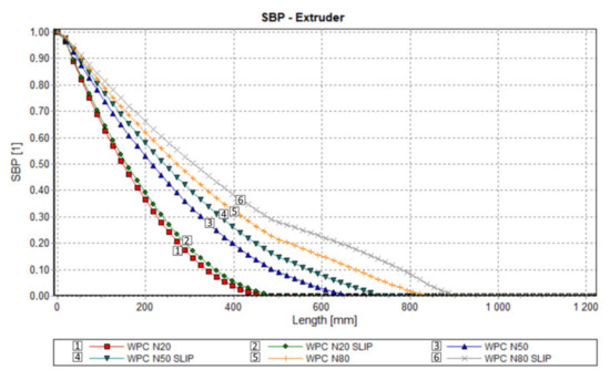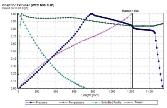 An effect of slip on the process flow is clearly seen in Table 1 and Figure 12, Figure 13 and Figure 14. Table 1 shows that the flow rate (extrusion throughput) increases when slip appears. The pressure decreases when slip appears (Figure 12), and melting is slower in this case, which may be caused by an increase in the flow rate (Figure 13). Power consumption is a bit higher in the case when slip appears, which may also result from an increase in the flow rate (Figure 14).