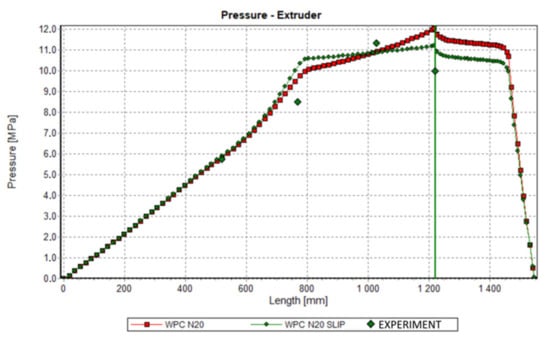 Validation of simulations has been performed in this paper at the process simulation data, which were presented above. Various screw speeds N = 20 rpm, 50 rpm, and 80 rpm were applied, and the barrel/die temperature profile was set as T = 185 °C, 190 °C, 190 °C, 170 °C. The pressure was measured along the screw, and in the die.