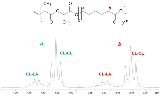 The microstructure characterization of the copolymers was carried out by 1H and 13NMR spectroscopy. When comparing the 1H NMR spectra, while for the block copolymers poly-(L-lactide-block-ε-caprolactone) and poly(D,L-lactide-block-ε-caprolactone) the signals observed were just those relative to the homosequences, i.e., those that one could observe by the superimposition of the corresponding homopolymers NMR spectra (see e.g., Figure 1), in the case of the random copolymer poly(L-lactide-co-ε-caprolactone) additional resonances, attributable to the CL-LA heterosequences, were instead observed. In particular, the caprolactone methylene signals in α and ε positions respect to the carbonyl are sensitive to their surroundings, and appeared at lower fields when the next unit is a lactide (Figure 2).