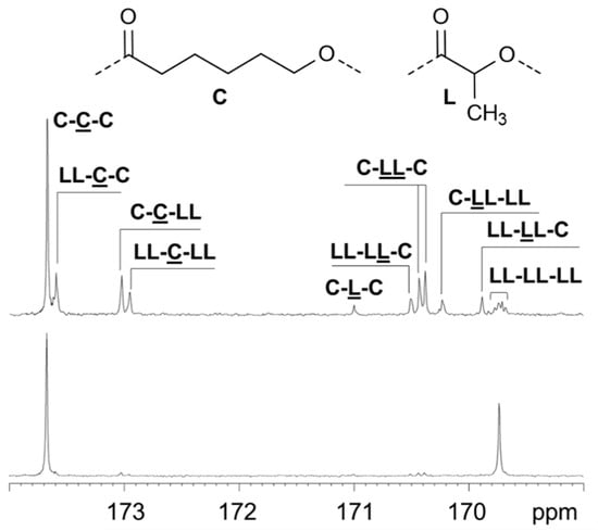 Carbonyl regions of the 13C NMR spectra of: (top) poly-(L-Lactide-co-ε-caprolactone) and (bottom) poly-(L-lactide-block-ε-caprolactone) (CDCl3, 25 °C, 600 MHz).