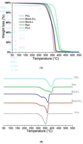 Thermogravimetric analysis (TGA) has been carried out in order to both determine the thermal stability of the samples and verify the presence of impurity such as catalytic residue, solvents or monomers. Figure 4A reports the weight loss of the synthetized materials as function of the temperature in nitrogen atmosphere. For comparison, degradation curves for commercial PLA and PCL are also reported. At higher temperatures, all curves show a very small amount of inert residue (less than 0.1%). It suggests the absence of inorganic impurity in the synthetized materials. As expected, the PLA degrade at temperatures lower than that of PCL [45,46]. In particular, the temperatures at 5% mass loss (T5%) were found at 312 °C and 355 °C for PLA and PCL, respectively. Both homo-polymers degrade in a single step with inflection point at 355 °C and 393 °C, respectively. The degradation curves of the synthetized block co-polymers fall between the two previous curves. However, multiple degradation steps are evident from their shapes. For a better visualization, the first derivatives of the TG curves (DTG) are reported in Figure 4B. Two peaks corresponding to the maximum degradation temperature of PLA and PCL are showed by the three co-polymers. Their position and relative high are evidently correlated to the ε-CL/LA molar ratio present in the copolymers.