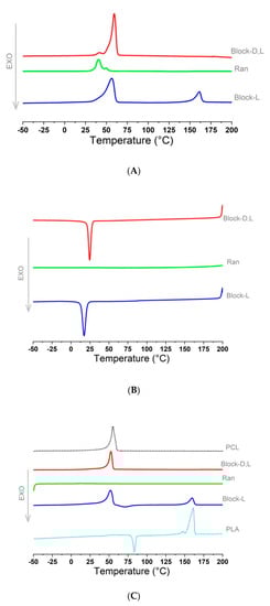 In Figure 5B, the cooling scans from the melt state of the copolymer are reported. It is worth noting that, under the selected experimental conditions (cooling at 10 °C/min), Block-D,L and Block-L crystallizes while Ran does not show any crystallization peak. This fact evidences a strong difference in the crystallization rate of the samples. In particular, the lower crystallization temperature showed by the Block-L sample could be related to the high content of LA segments, which slow down the reorganization of the polymer segments for crystallizing.