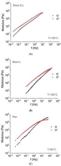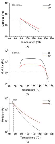 The thermo-rheological response of the copolymer was firstly analyzed with isochronal measurements. Figure 6 shows the evolution of the elastic (G′) and viscous (G″) moduli in a temperature sweep experiments. As temperature increases, a gradual transition is noticed from a solid-like behavior (G′ > G″) to a liquid-like behavior (G′ < G″) [47]. The temperatures at which the moduli cross (G′ = G″) are completely different in the three copolymers. These transitions are associated to the melting of the physical crosslinking formed by the crystals present in the matrix. As show by the previous DSC results, these temperatures correspond to the melting peak temperatures of the crystalline phases Figure 6. For example, the Block-D,L shows a melting temperature at Tm = 59 °C, which correspond to the temperature crossover of the moduli observed at T = 77 °C.