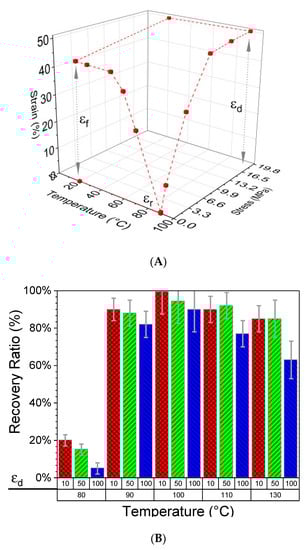 Experimental results of tests carried out by changing the deformation temperature and the deformation strain are showed in Figure 8B. Rr is found strongly depend on both the deformation temperature and the initial strain (εd). In the best case, the Rr ratio is high than 99%, whereas the Rf ratio values reached 85%. Repeated experiments on the sample indicate that, for the chosen conditions, only small differences are found between the thermomechanical cycles. These results demonstrate the excellent ability of Block-L materials to recover their initial shape.