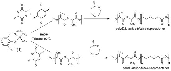 Oil-derived polymers still dominate the market today, due to their low cost, high availability, and durability. However, the problem related to their end-of-life disposal presents an environmental challenge that is no longer sustainable in the long term [1,2]. In recent years, constant scientific efforts have been dedicated to the production of synthetic biodegradable polymers with a reduced environmental impact [3]. Despite the huge amount of research efforts, the number of high-performance biodegradable polymers commercially available is still very limited. Among these, linear aliphatic polyesters represent the class of biodegradable materials that are the most studied [4]. Among these polymers, the leading position is undoubtedly held by poly(lactide) (PLA) and poly(ε-caprolactone) (PCL). Their synthesis can be achieved by the ring-opening polymerization (ROP) of the cyclic esters lactide (LA) and ε-caprolactone (CL), respectively [4,5]. Both PLA and PCL have found applications in various sectors such as biomedical and packaging, thanks to their good properties [3,6]. Among other things, they are biocompatible and resorbable and their degradation products are metabolized during the Krebs cycle [6,7]. PLA can be derived from several renewable resources such as the fermentation products of starch [8]. This possibility has placed PLA at the forefront of the emerging biodegradable plastic industry, including in the context of a circular economy. The chirality of lactic acid gives rise to three lactides: L-, D-, and meso-lactide, whose polymerization will produce PLA of various stereoregularities. Homochiral isotactic PLA (either PLLA or PDLA) shows a melting transition of 180 °C and a glass transition in the range 55–60 °C [9]. The ROP of racemic mixture of D and L lactide (D,L-LA or rac-LA), in the absence of a stereoselective catalysts, will produce instead an amorphous polymer, the poly-(D,L-lactide), with a glass transition temperature close to 50 °C [10]. Unfortunately, the brittle nature of isotactic PLA limits its application [11]. For instance, for biomedical applications, because the glass transition temperature of poly-(D,L-lactide) (PDLLA) and poly(L-lactide) (PLLA) is well above the human body temperature, these materials are too stiff [6].
