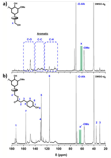As phloretic acid melts above 129 °C, its mixture with lignin in the presence of p-TSA allows the reaction to be performed in melt at 140 °C, at the condition the lignin is thermally stable at this temperature. Among the different commercial grades proposed by Tanovis AG, Protobind® 2400 technical lignin (P2400) was selected based on this parameter (Table S1, Figure S1 in Supplementary Materials), as the onset of its thermal degradation is not reached before 157 °C. The structural features of the esterified lignin (P2400-PA) were characterized by 1H, 13C and HSQC NMR. Due to the complex structure of lignin, the three techniques were essential to accurately define the structure of P2400 and to determine the structural changes coming from the esterification. 31P was also performed to quantify the rate of esterification. It is worthwhile to note that the esterification reaction was performed solventless. The 1H NMR spectra of P2400 and P2400-PA are reported in Figure 1.