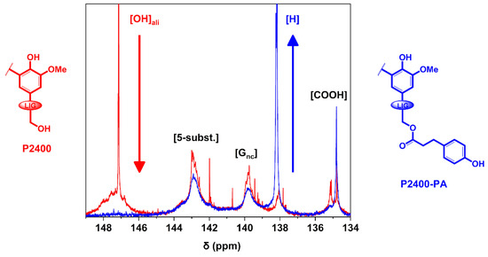 Finally, the carboxylic, aromatic and aliphatic ‒OH groups of lignin were identified and quantified by 31P NMR experiments [43]. The interval of the different types of lignin ‒OH groups were assigned as follows: aliphatic ‒OH (δOHali = 146–150 ppm), 5-substituted aromatic ‒OH (S and G condensed units, δ5-susbt. = 141–144.5 ppm), G non-condensed aromatic ‒OH (δGnc = 138.5–141 ppm), p-hydroxyphenyl aromatic ‒OH (δH = 137–138.5 ppm), and carboxyl groups (δCOOH = 134–136 ppm) (Figure S3) [45]. A magnification of the 31P NMR spectra of P2400 and P2400-PA between δ = 134–149 ppm is reported in Figure 4.