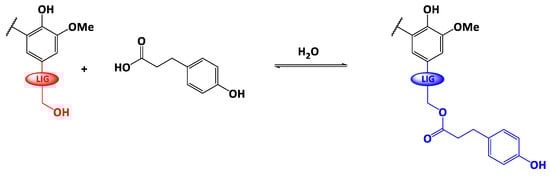 Fischer esterification of Protobind® lignin with phloretic acid (LIG= ‒O-Ar, ‒O-Alk).