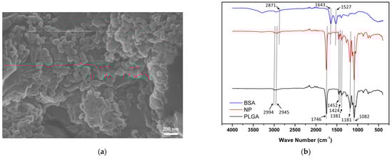 Composition of as-prepared BSA-laden NPs was confirmed by ATR-FTIR spectrometry. As shown in Figure 1b, the black curve represented PLGA, which had three characteristic peaks attributed to the three different monomer sequences of PLGA polymer chains of lactide-glycolide at 1381 cm−1, glycolide-glycolide at 1424 cm−1, and lactide-lactide at 1452 cm−1. PLGA spectra also had several characteristic peaks corresponding to specific chemical structures in the PLGA polymer including 1082 cm−1 and 1181 cm−1 (C–O bond), 2945 cm−1, and 2994 cm−1 (CH bond), and 1746 cm−1 (C=O bond). The blue curve indicated BSA, which had the typical protein characteristic peaks at 1643 cm−1 (amide I) and 1527 cm−1 (amide II), and a visible peak at 2871 cm−1 was attributed to the CH bond. The red curve indicated BSA-laden PLGA NPs, which had the characteristic peaks of both BSA and PLGA polymers, indicating successful encapsulation of BSA into PLGA nanoparticles.