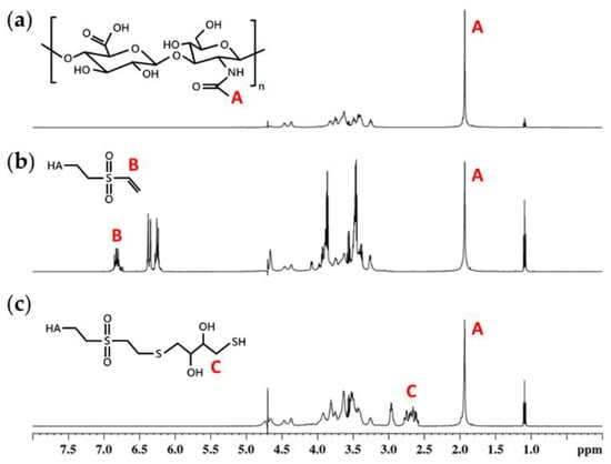 H1-NRM spectra of (a) hyaluronan (HA), (b) divinyl sulfone functionalized HA (HA-VS) polymer, and (c) thiolated HA (HA-SH) polymer. The degree of modification of HA-VS polymer was 29 % calculated by comparing the area under peak at 6.8 ppm (carbon−carbon double bond of vinyl sulfone groups), indicated by B, to peak at 1.9 ppm (N-acetyl glucosamine of HA), indicated by A.
